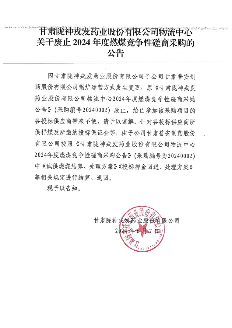 甘肃陇神戎发药业股份有限公司物流中心关于废止2024年度燃煤竞争性磋商采购的公告
