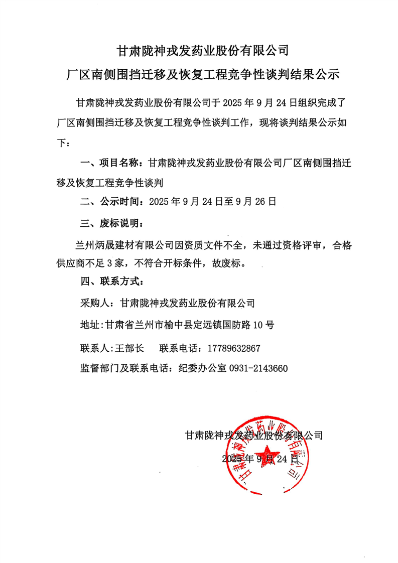甘肃陇神戎发药业股份有限公司厂区南侧围挡迁移及恢复工程竞争性谈判结果公示