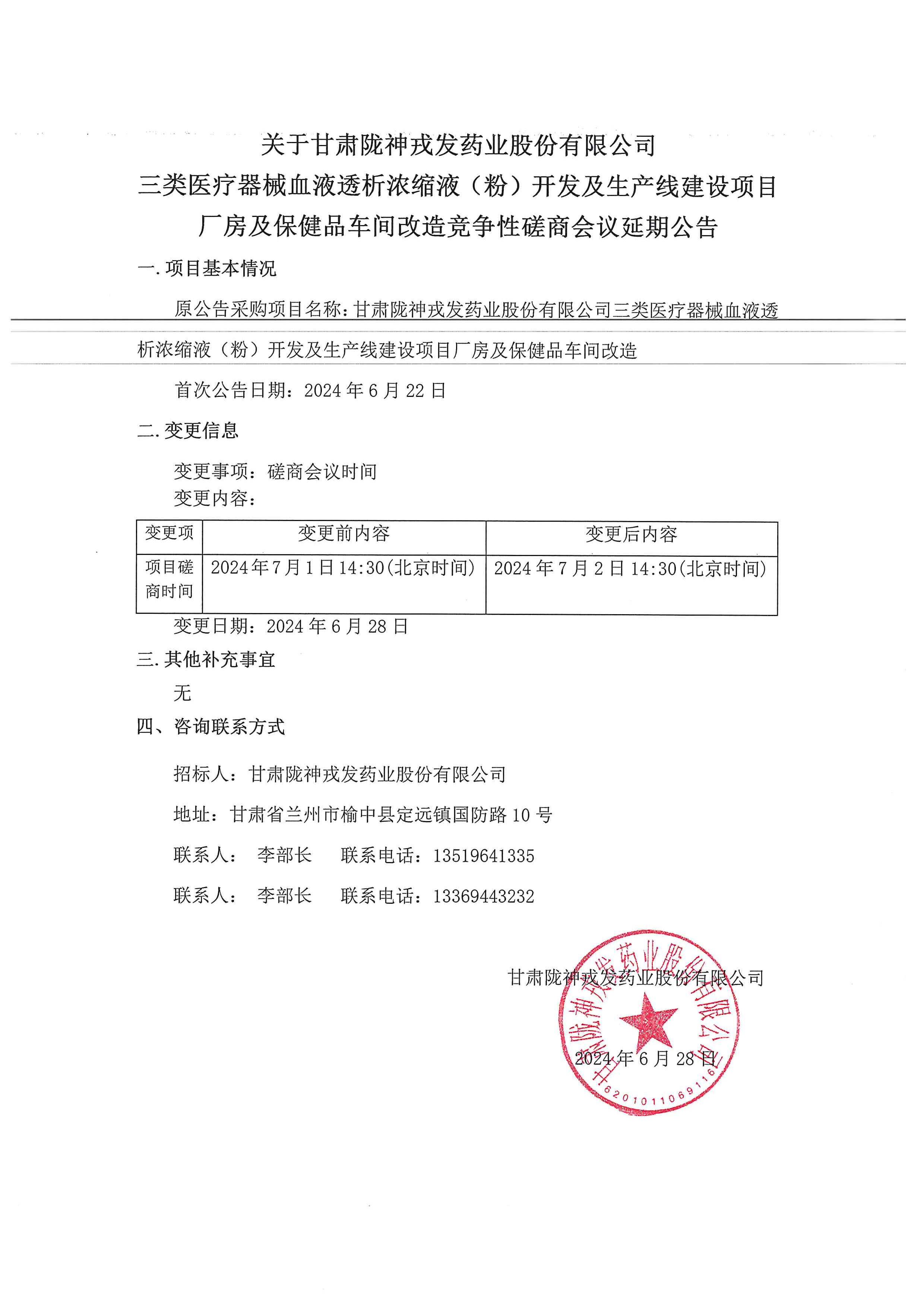 关于甘肃陇神戎发药业股份有限公司三类医疗器械血液透析浓缩液(粉)开发及生产线建设项目厂房及保健品车间改造竞争性磋商会议延期公告