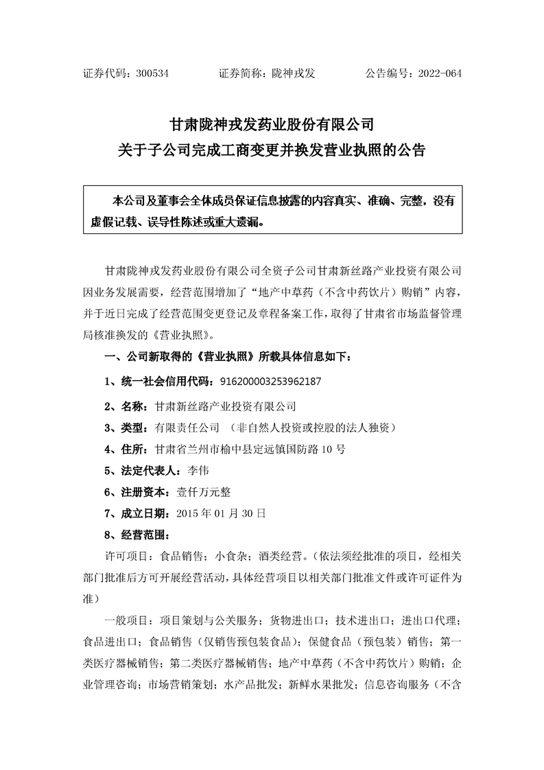 关于子公司完成工商变更并换发营业执照的公告