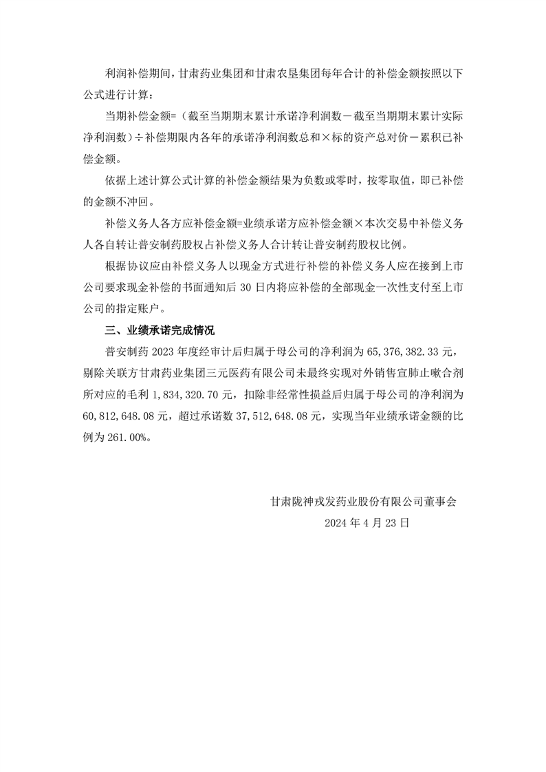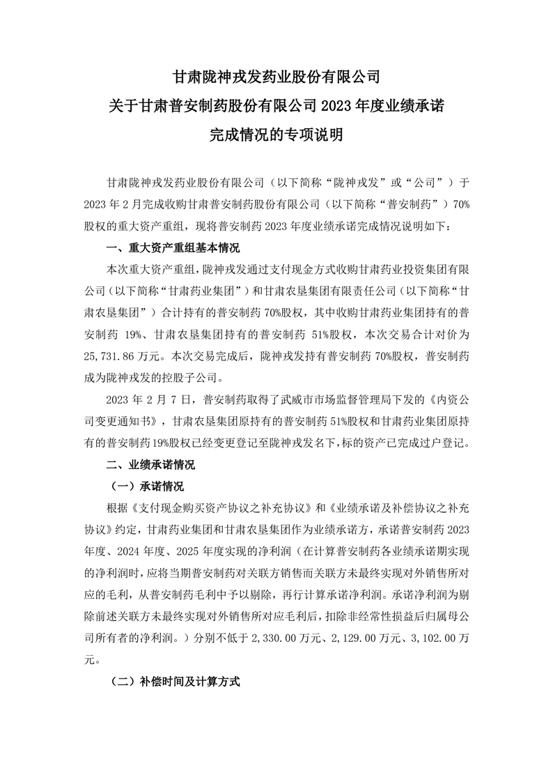 关于甘肃普安制药股份有限公司2023年度业绩承诺完成情况的专项说明