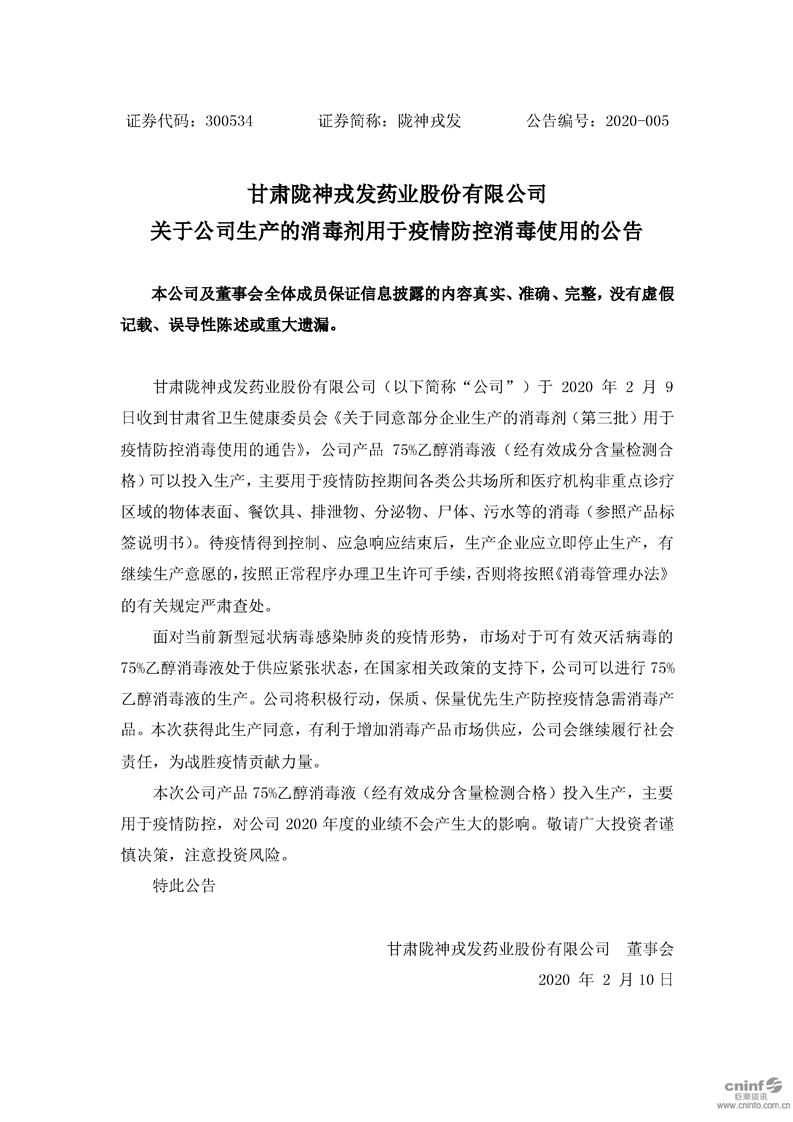关于公司生产的消毒剂用于疫情防控消毒使用的公告