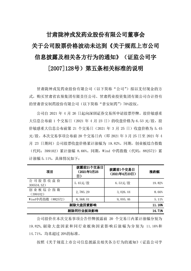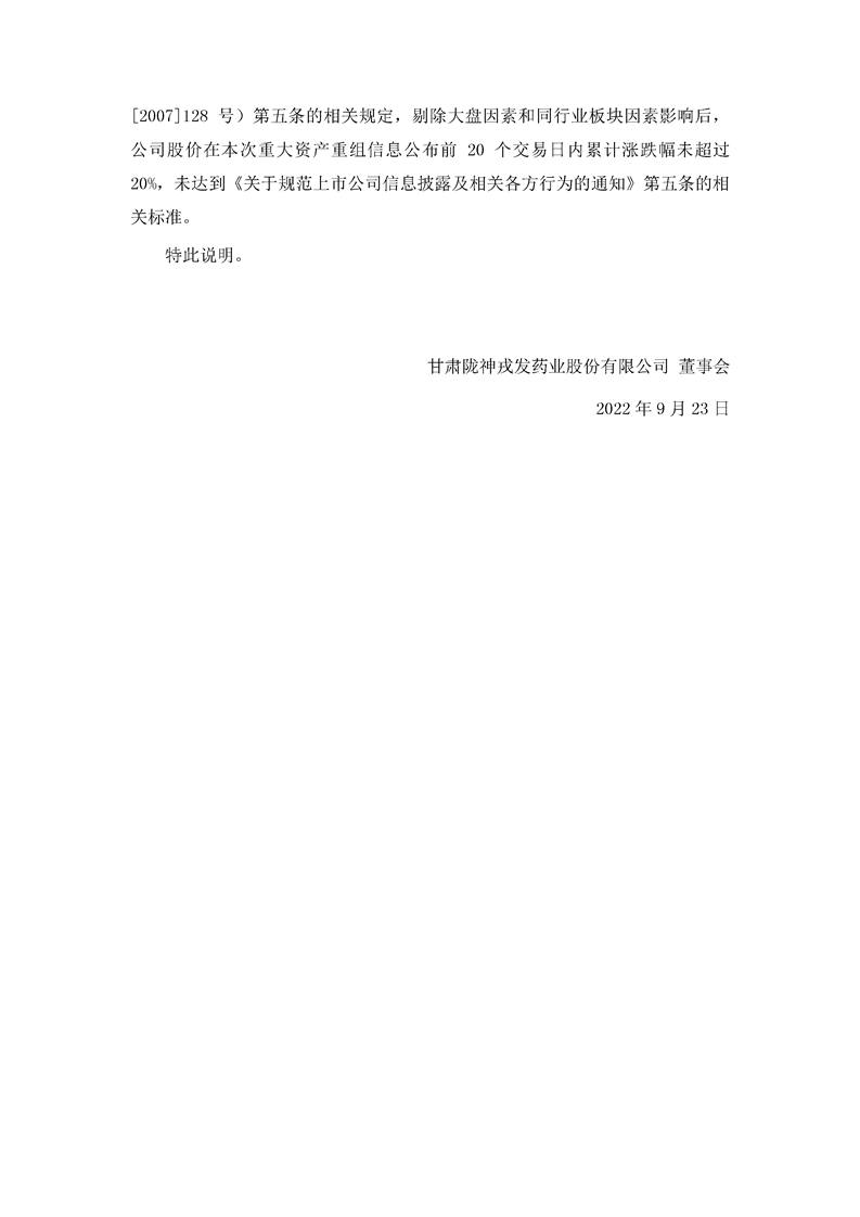 董事会关于公司股票价格波动未达到《关于规范上市公司信息披露及相关各方行为的通知》(证监公司字[2007]128号)第五条相关标准的说明