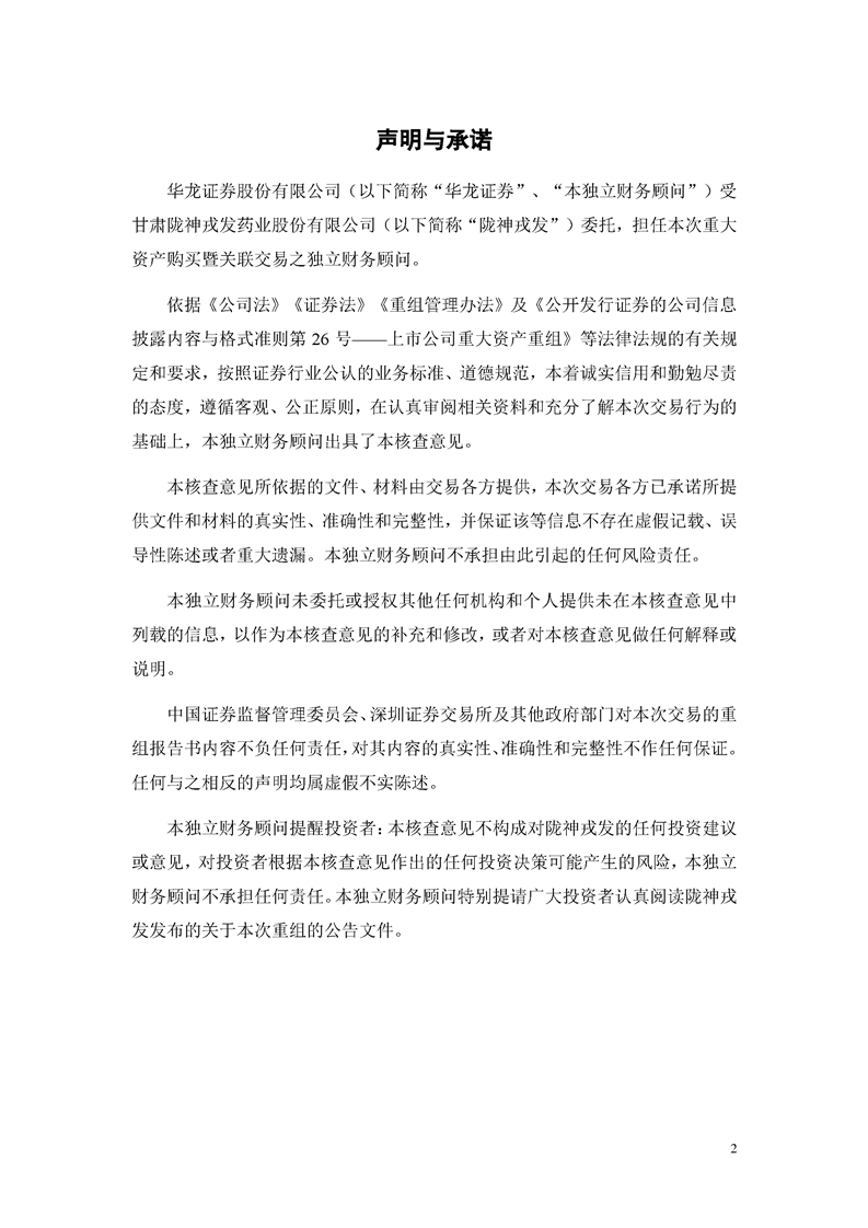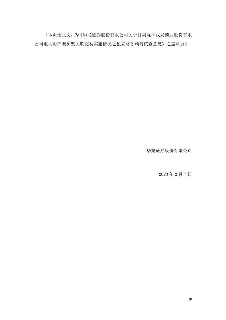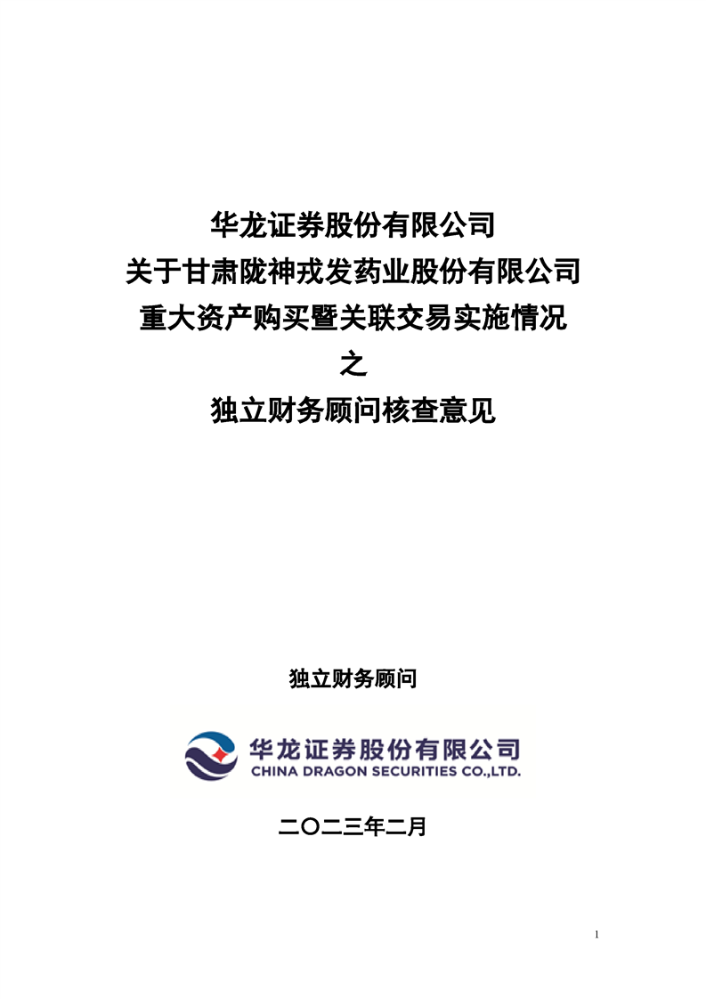 华龙证券股份有限公司关于甘肃陇神戎发药业股份有限公司重大资产购买暨关联交易实施情况之独立财务顾问核查意见