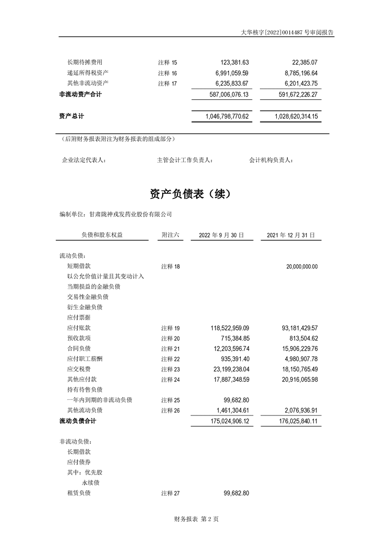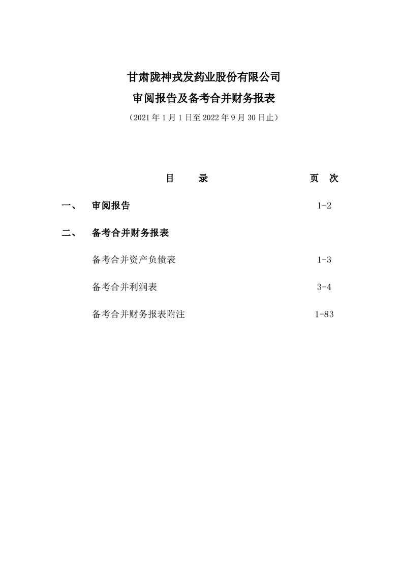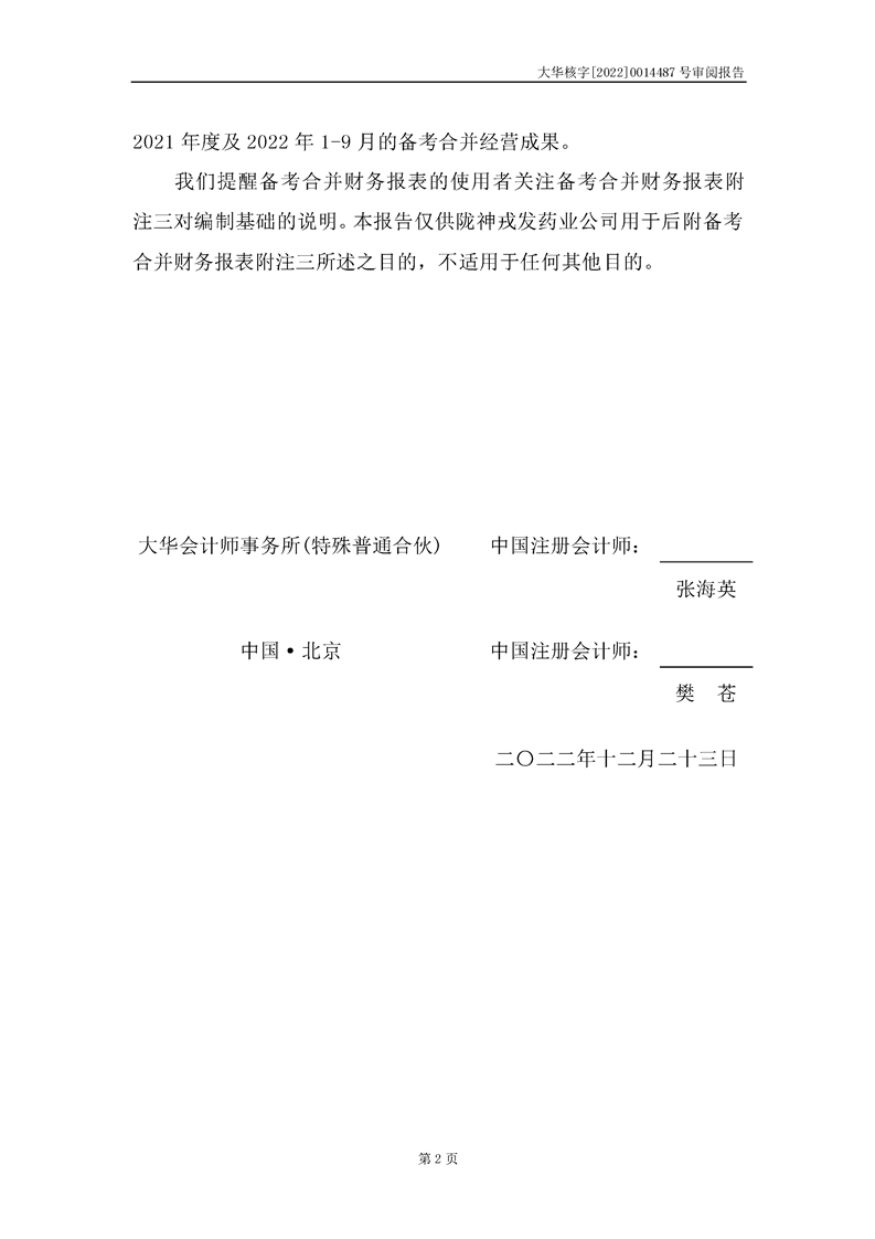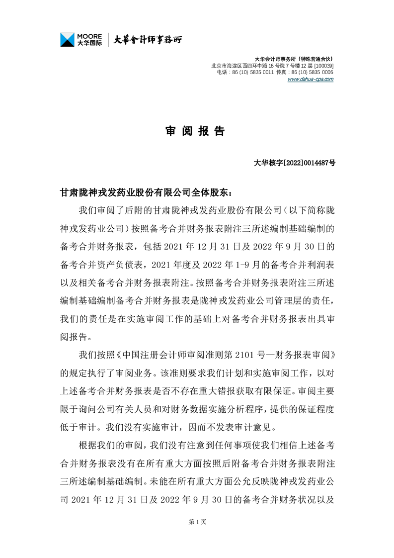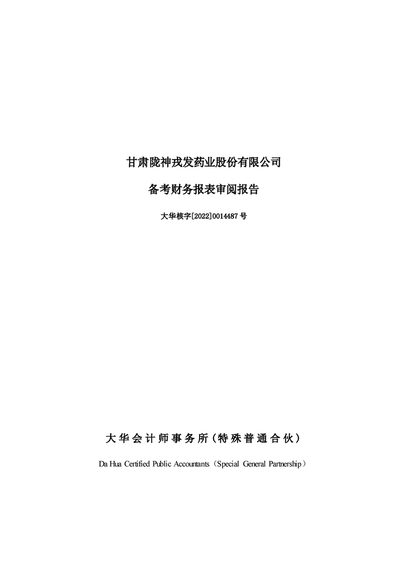甘肃陇神戎发药业股份有限公司备考财务报表审阅报告-大华核字[2022]0014487号