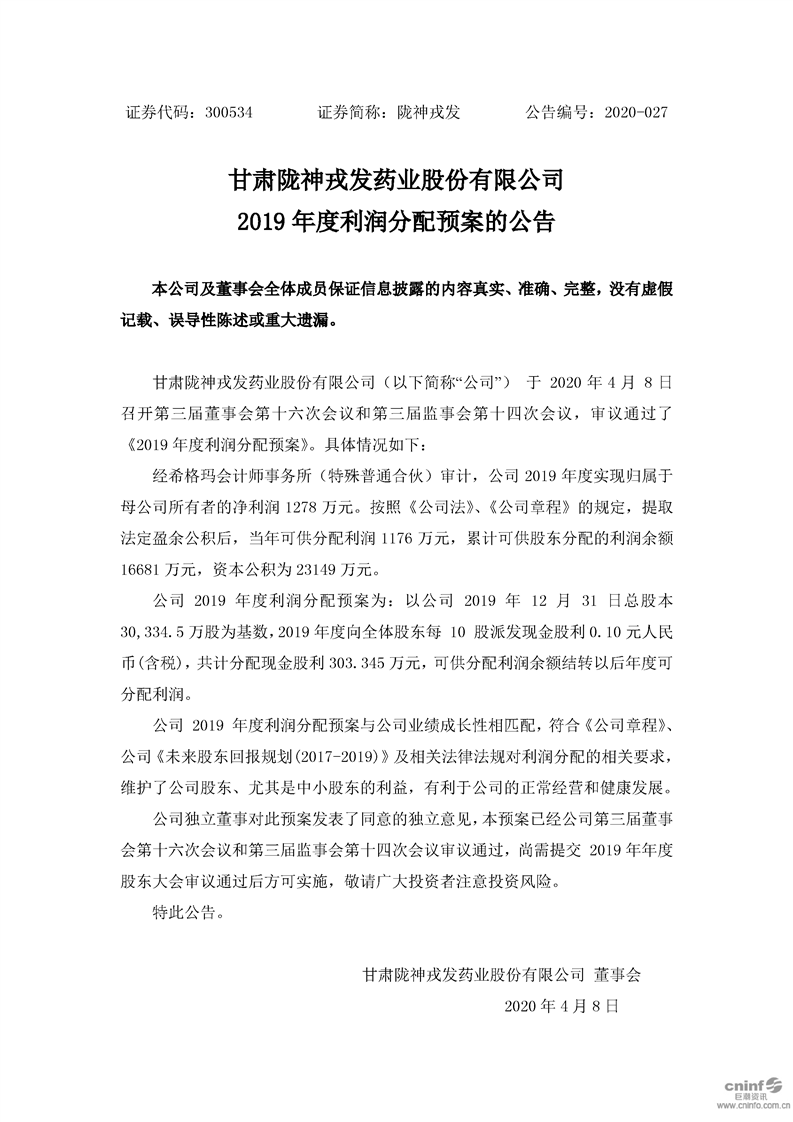2019年度利润分配预案的公告