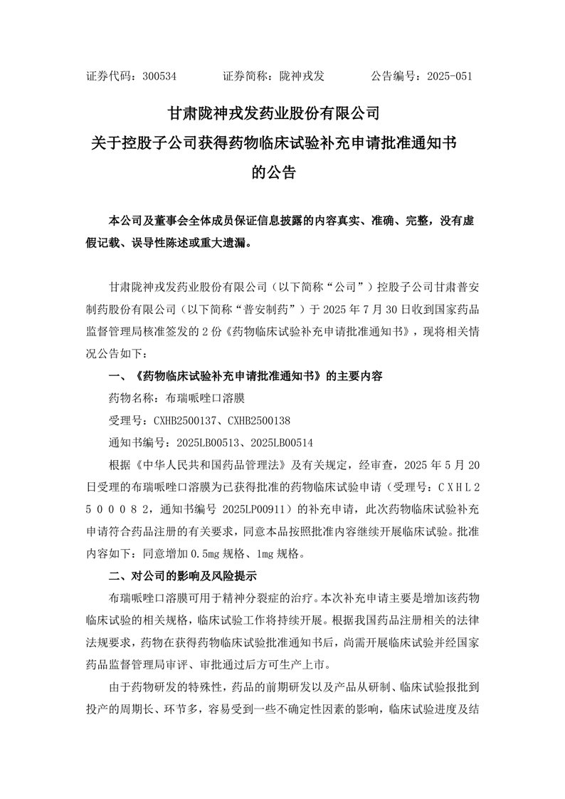 关于控股子公司获得药物临床试验补充申请批准通知书的公告