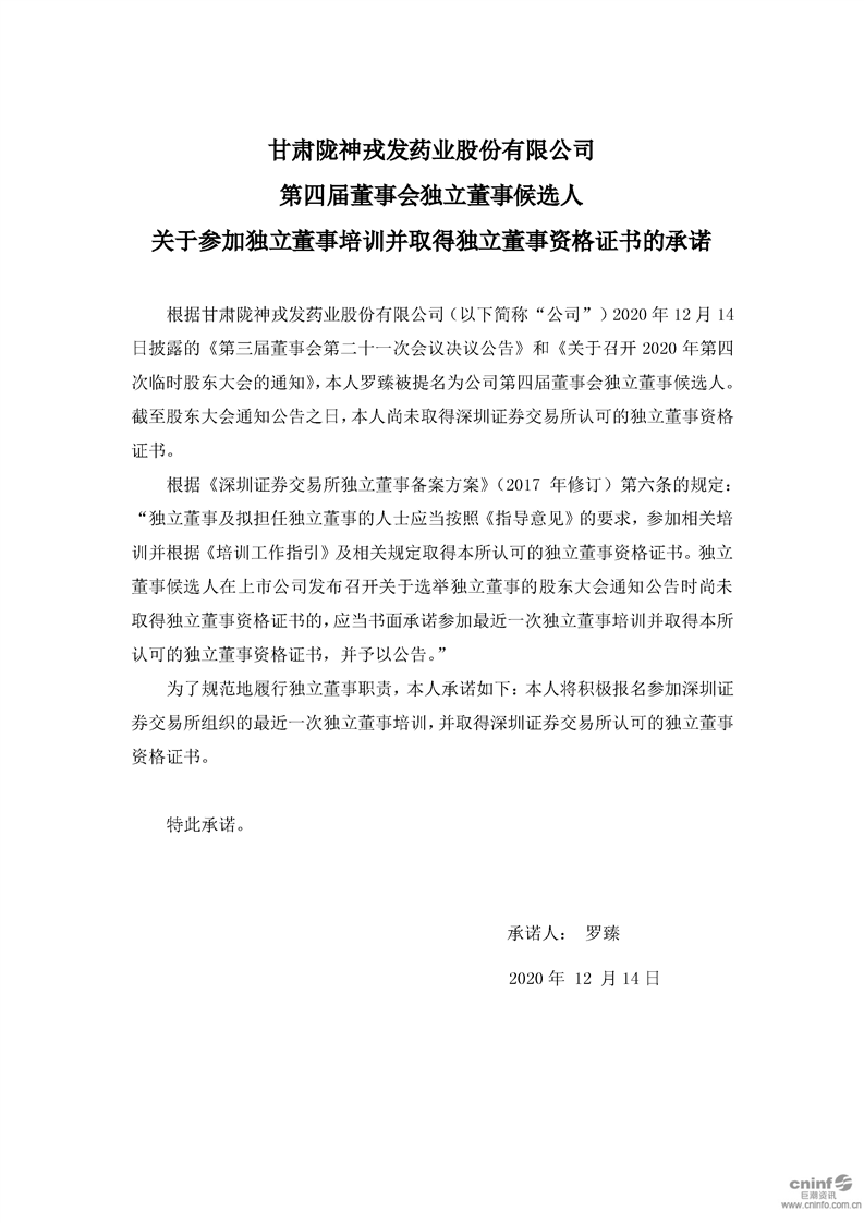 第四届董事会独立董事候选人关于参加独立董事培训并取得独立董事资格证书的承诺