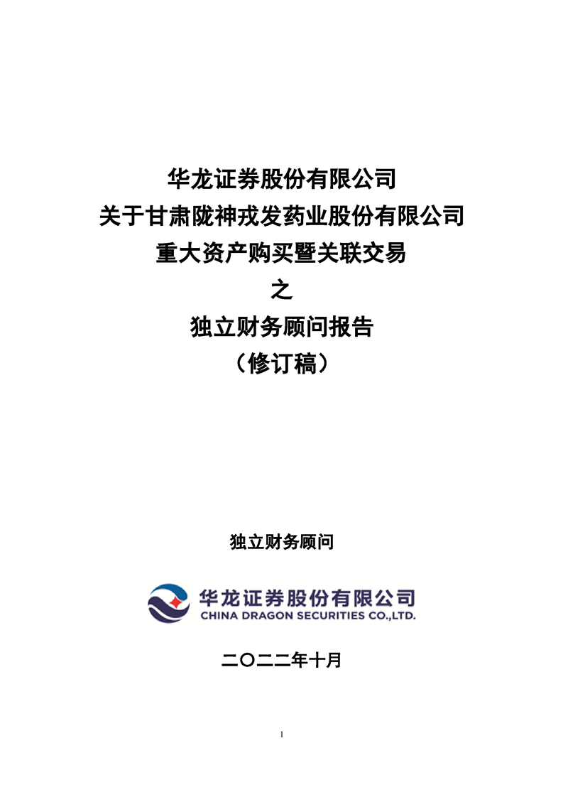 华龙证券股份有限公司关于甘肃陇神戎发药业股份有限公司重大资产购买暨关联交易之独立财务顾问报告(修订稿)