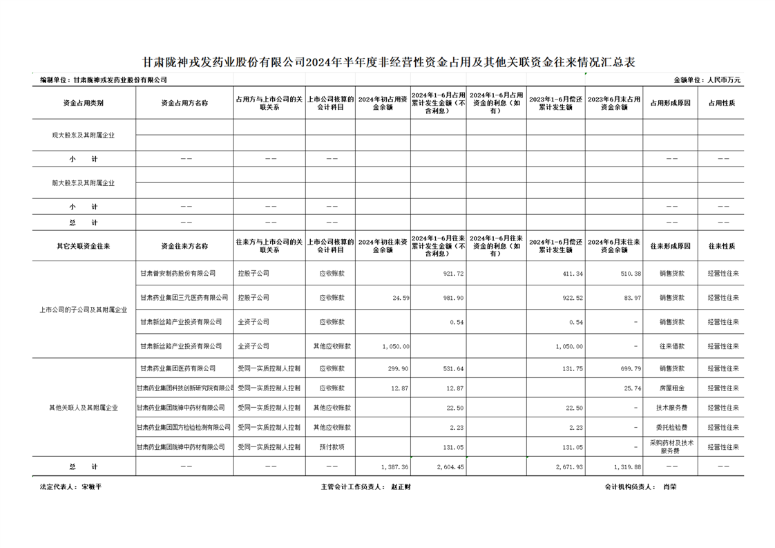 2024年半年度非经营性资金占用及其他关联资金往来情况汇总表