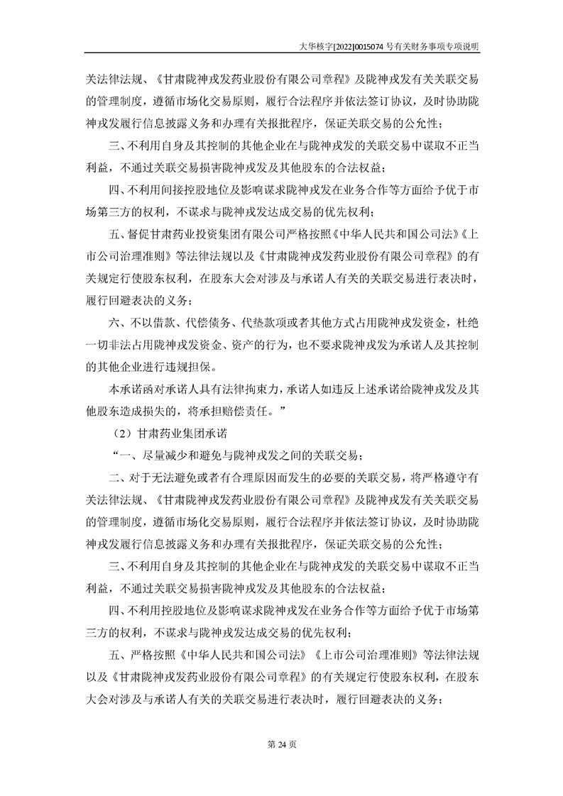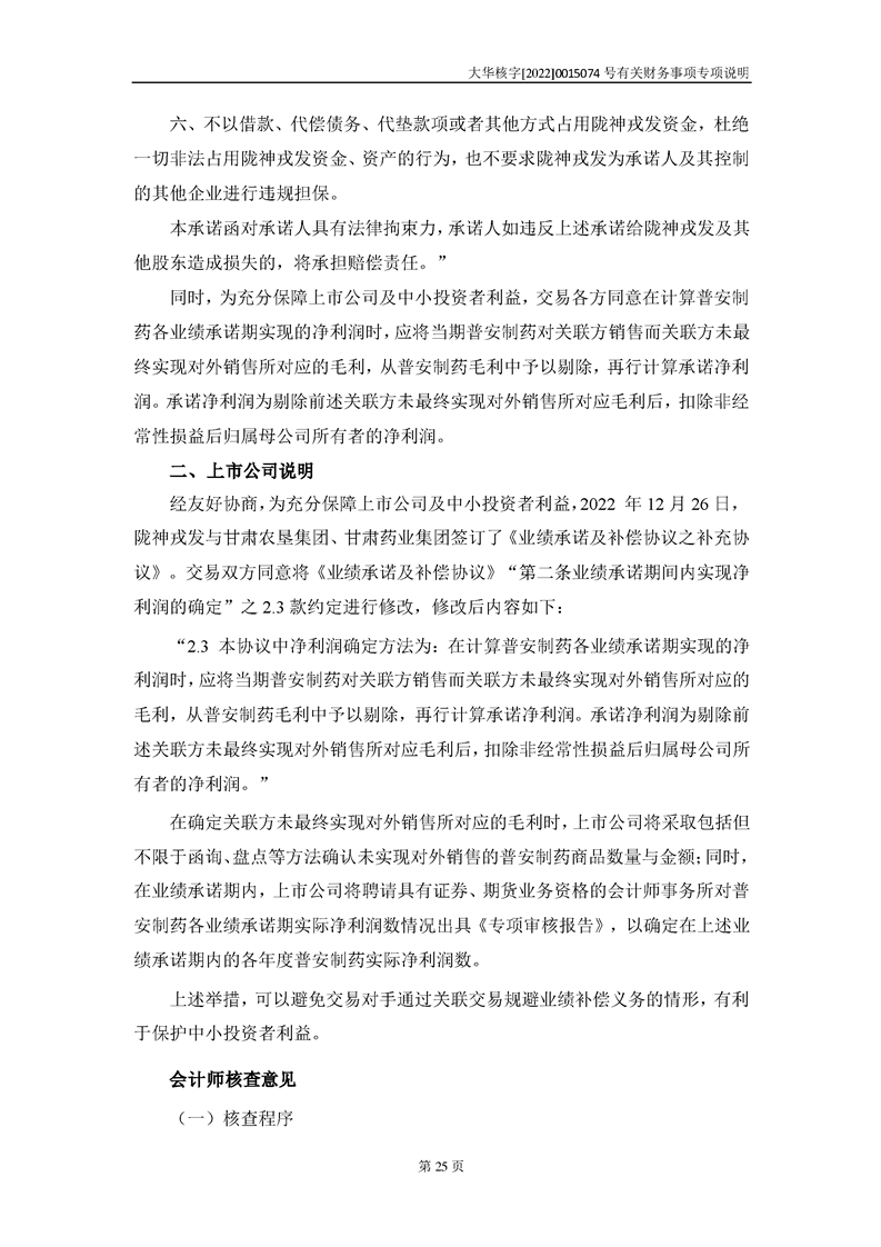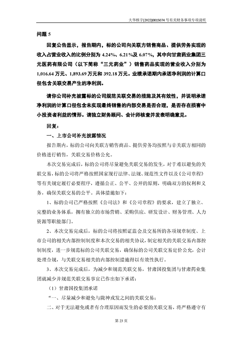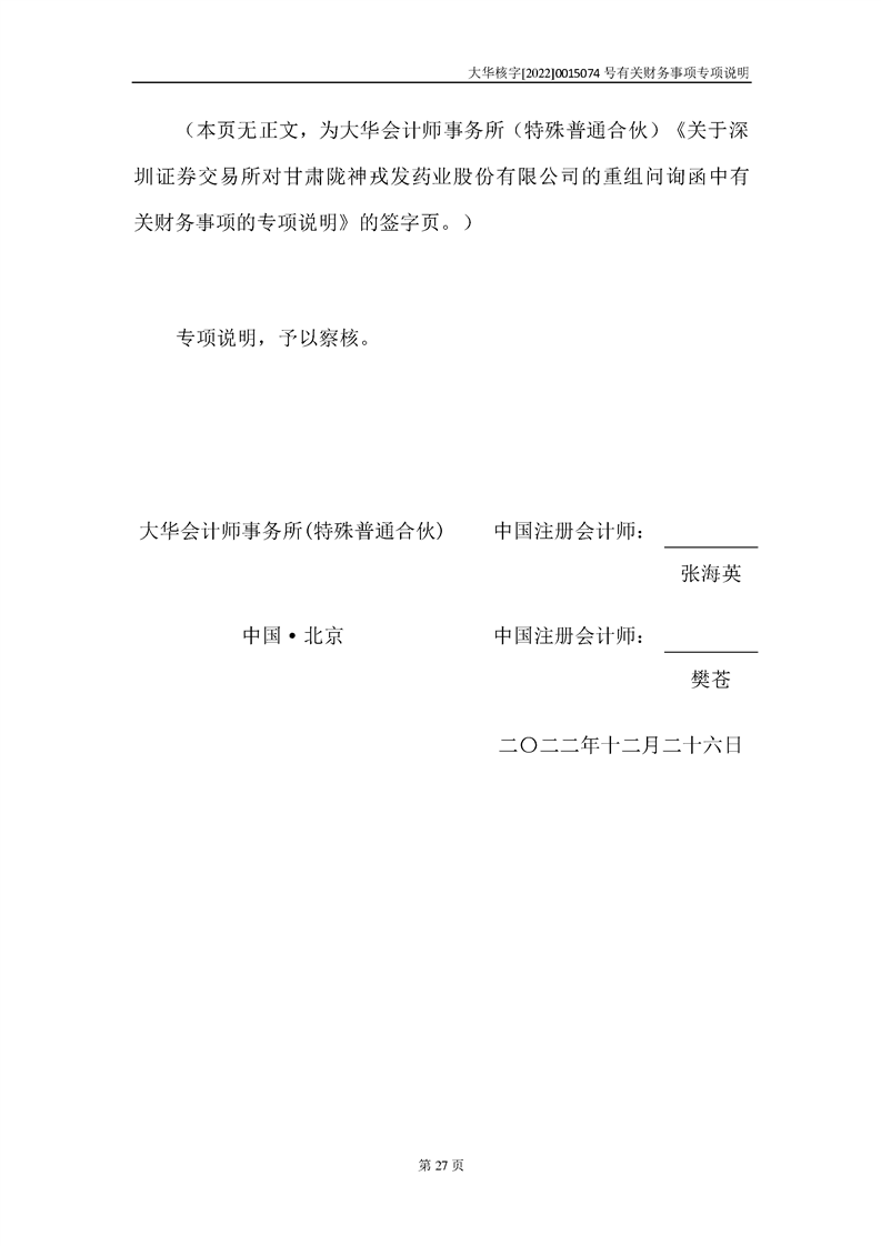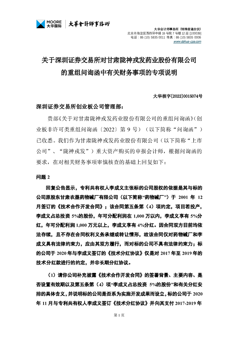 关于深圳证券交易所对甘肃陇神戎发药业股份有限公司的重组问询函中有关财务事项的专项说明-大华核字[2022]0015074号