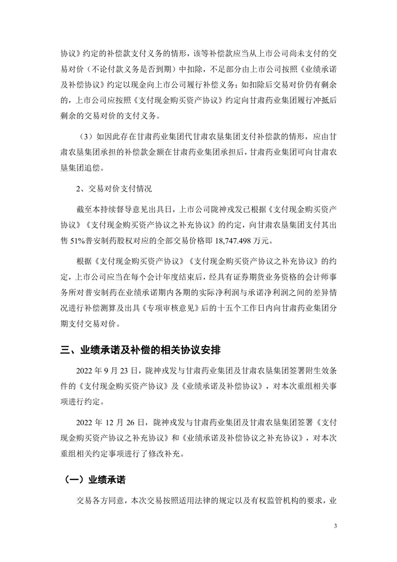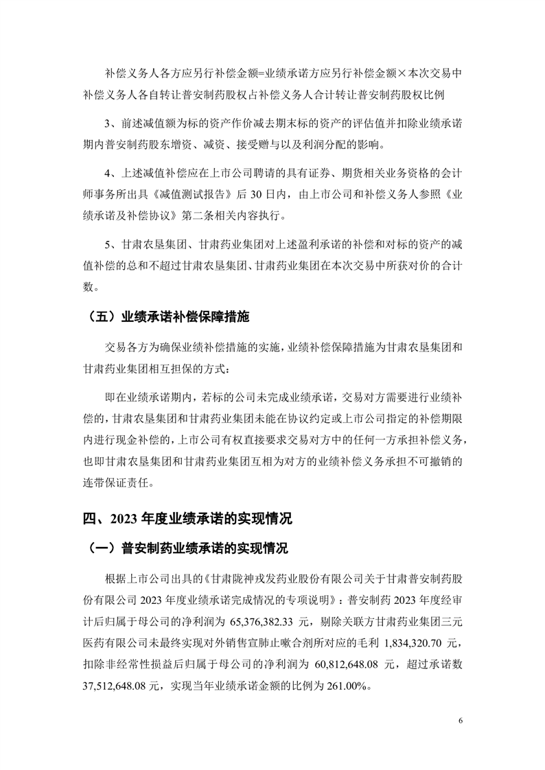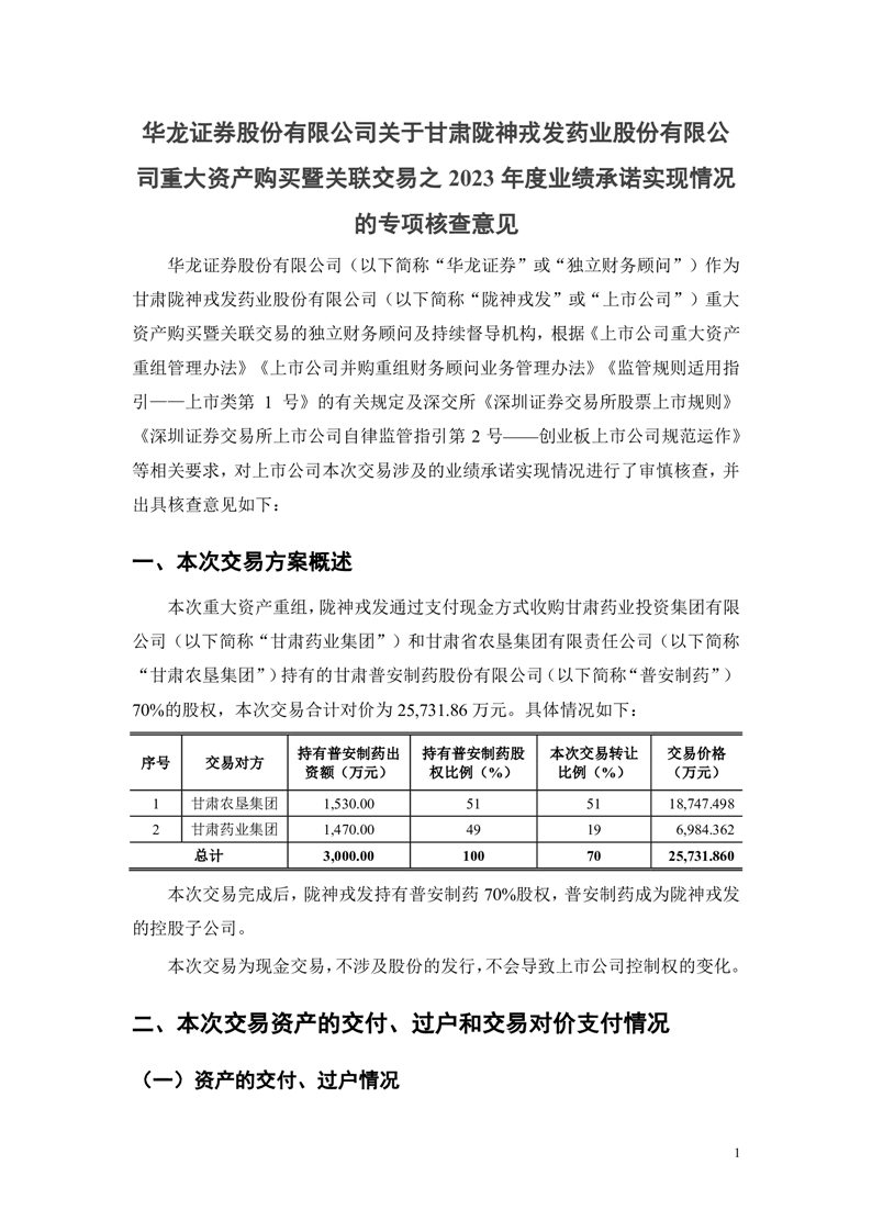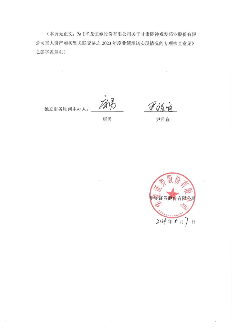 华龙证券股份有限公司关于甘肃陇神戎发药业股份有限公司重大资产购买暨关联交易之2023年度业绩承诺实现情况的专项核查意见(更正后)