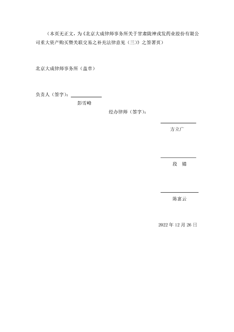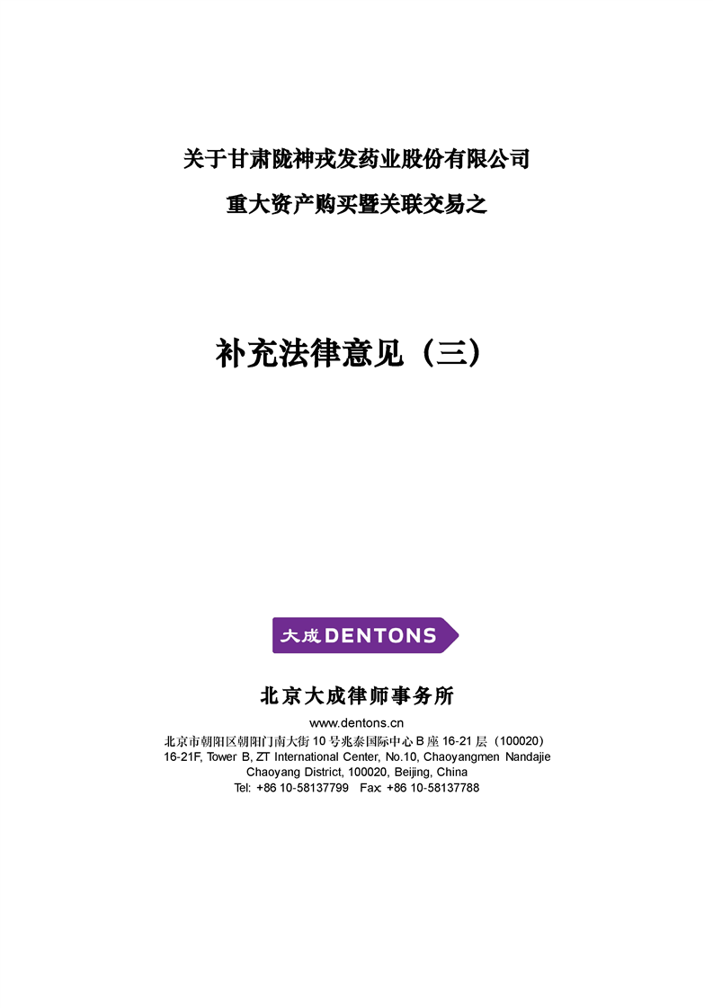 北京大成律师事务所关于甘肃陇神戎发药业股份有限公司重大资产购买暨关联交易补充法律意见(三)