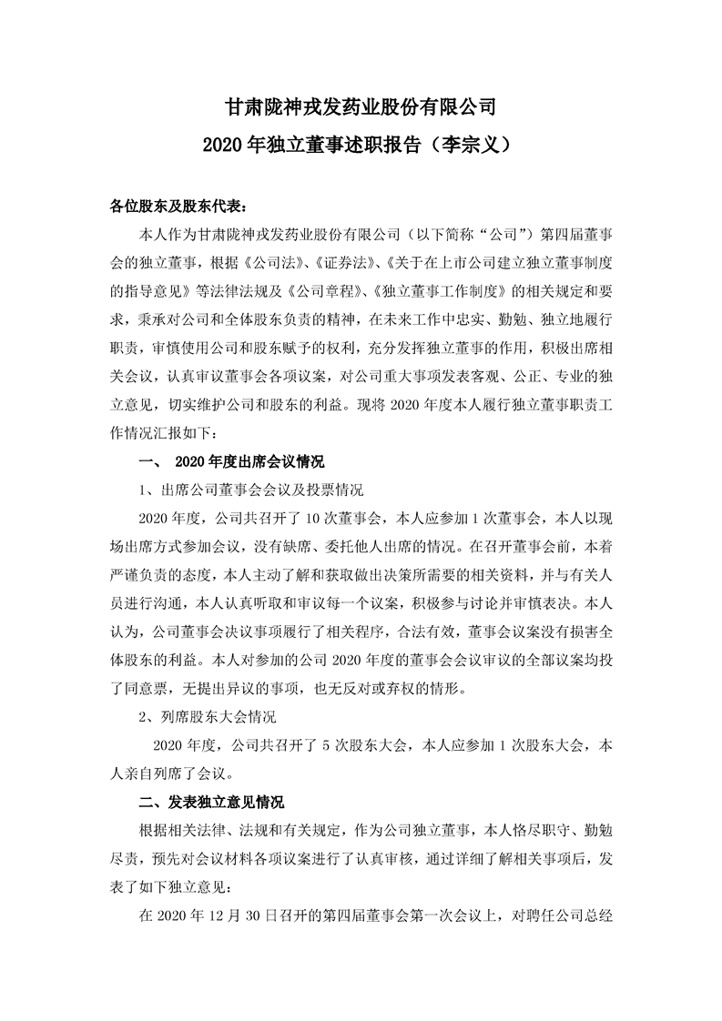 2020年独立董事述职报告(李宗义)