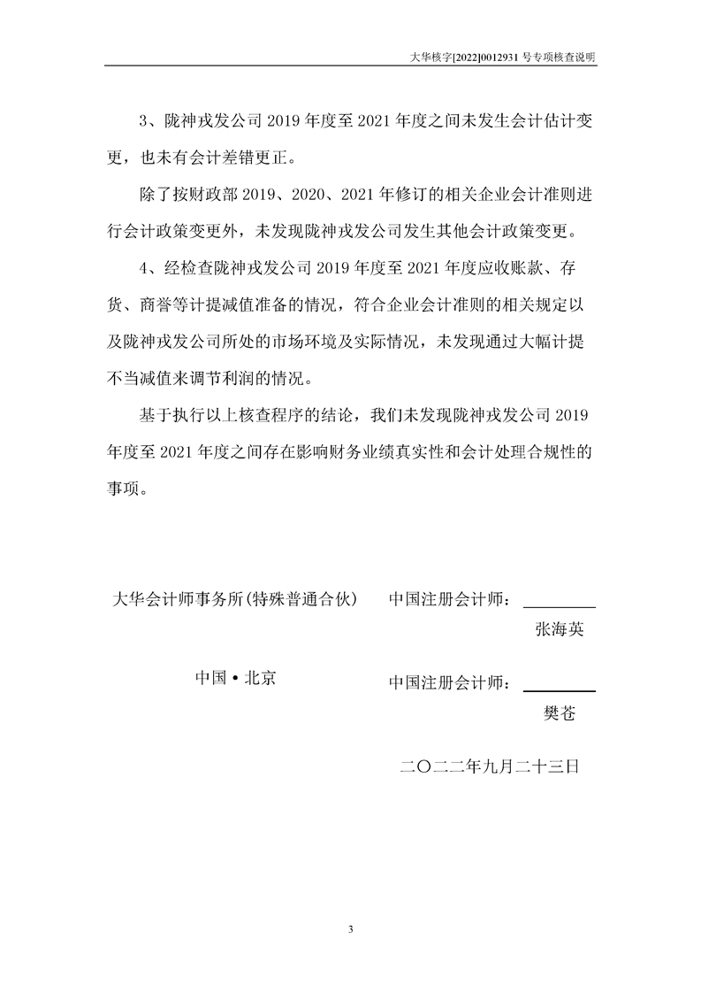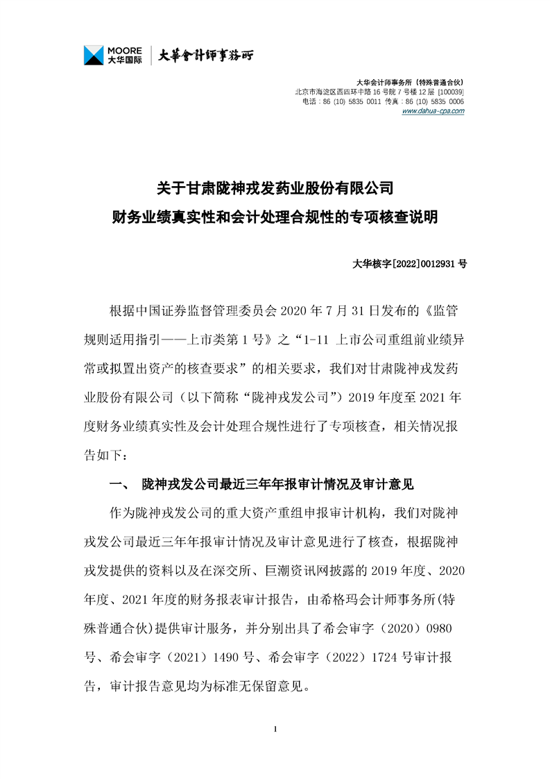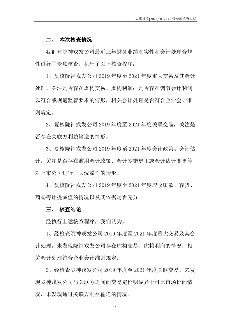 大华会计师事务所关于陇神戎发财务业绩真实性和会计处理合规性的专项核查说明