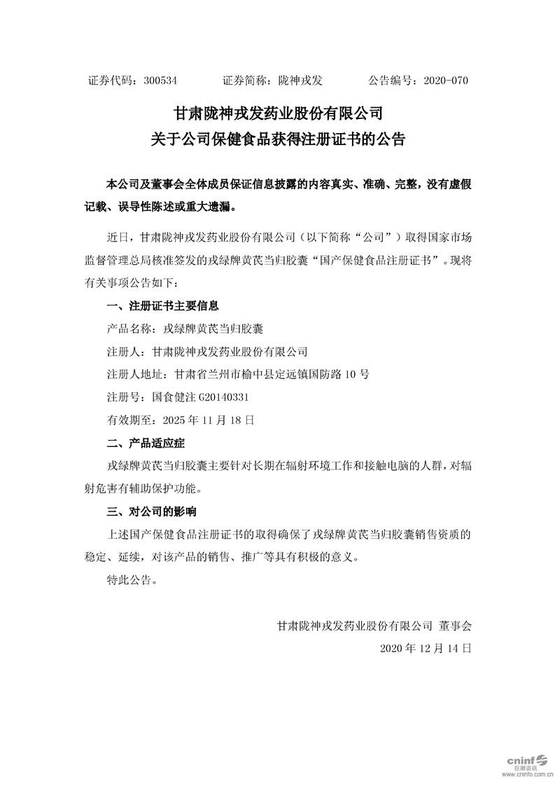 关于公司保健食品获得注册证书的公告