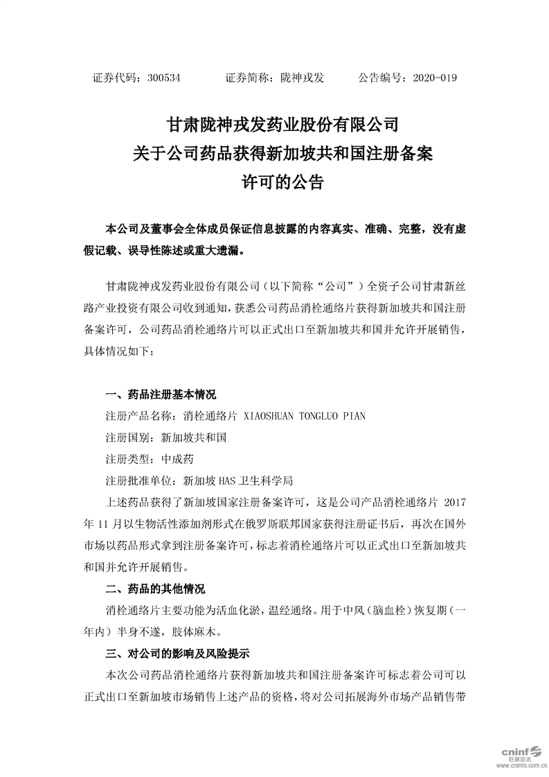 关于公司药品获得新加坡共和国注册备案许可的公告