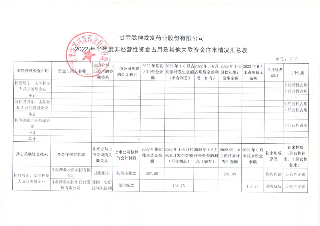 2022年半年度非经营性资金占用及其他关联资金往来情况汇总表