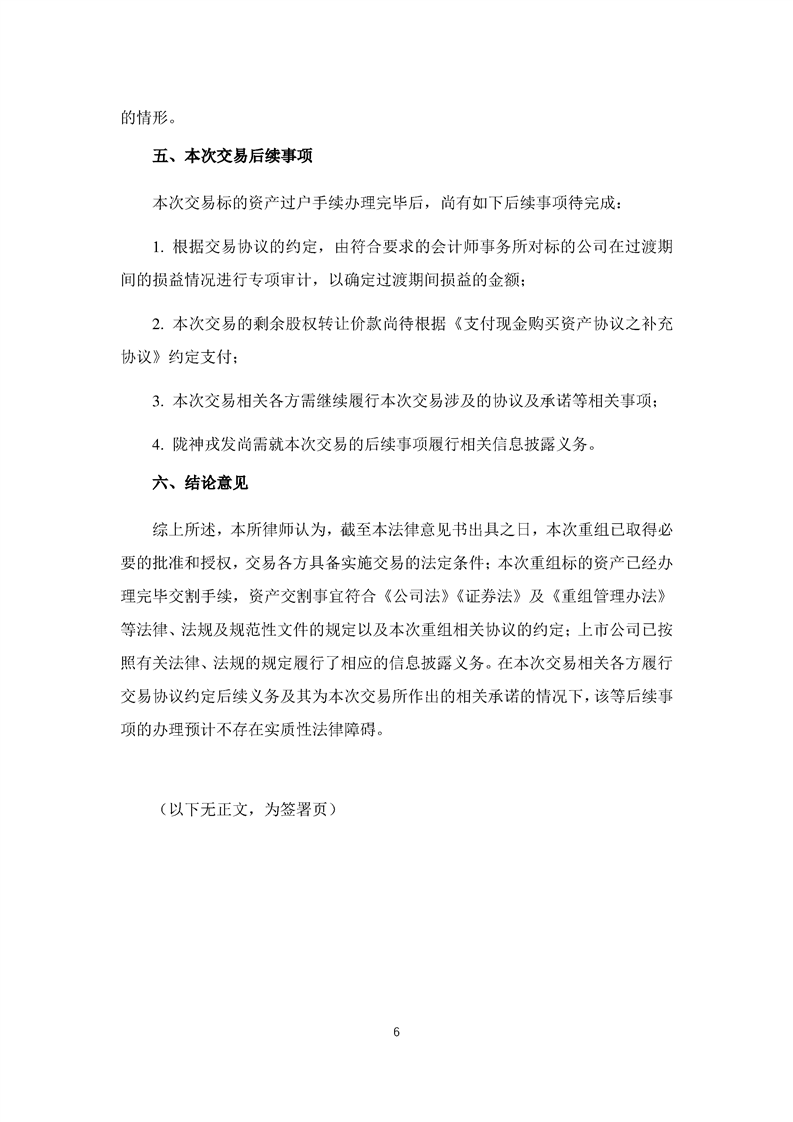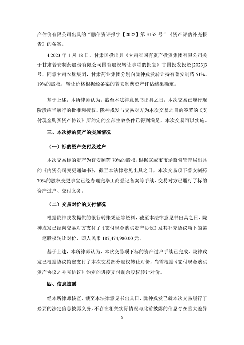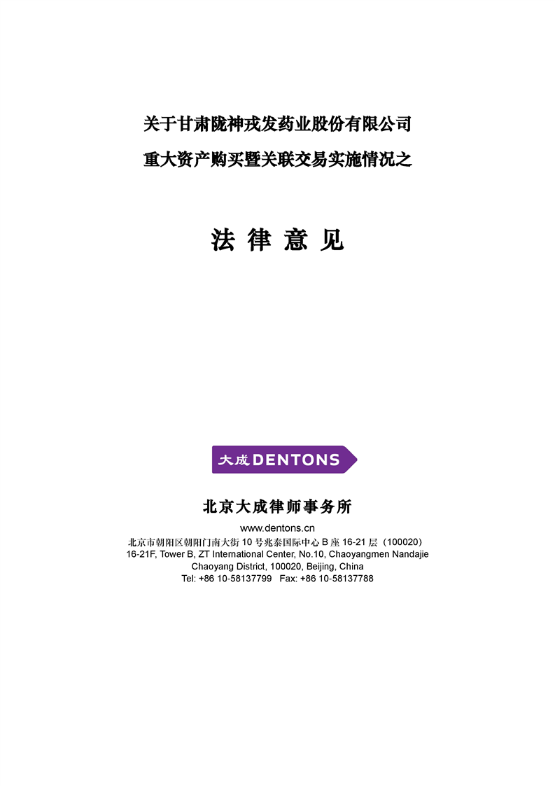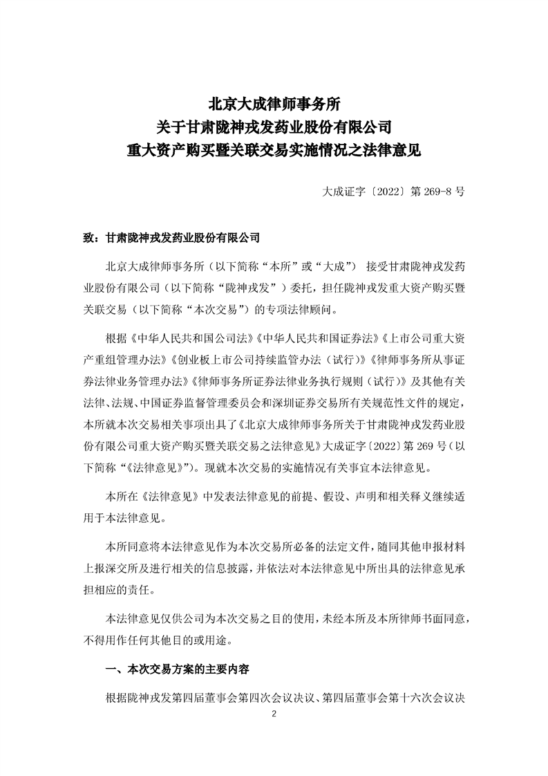 北京大成律师事务所关于甘肃陇神戎发药业股份有限公司重大资产购买暨关联交易之实施情况的法律意见
