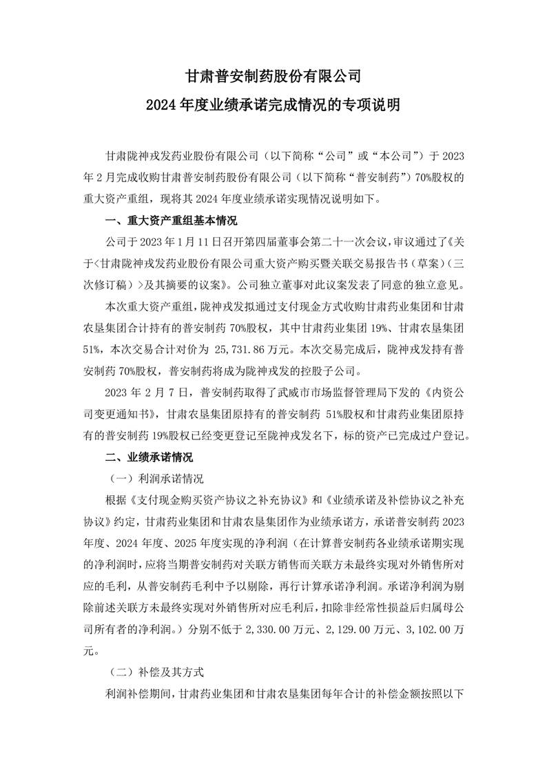 甘肃普安制药股份有限公司2024年度业绩承诺完成情况的专项说明