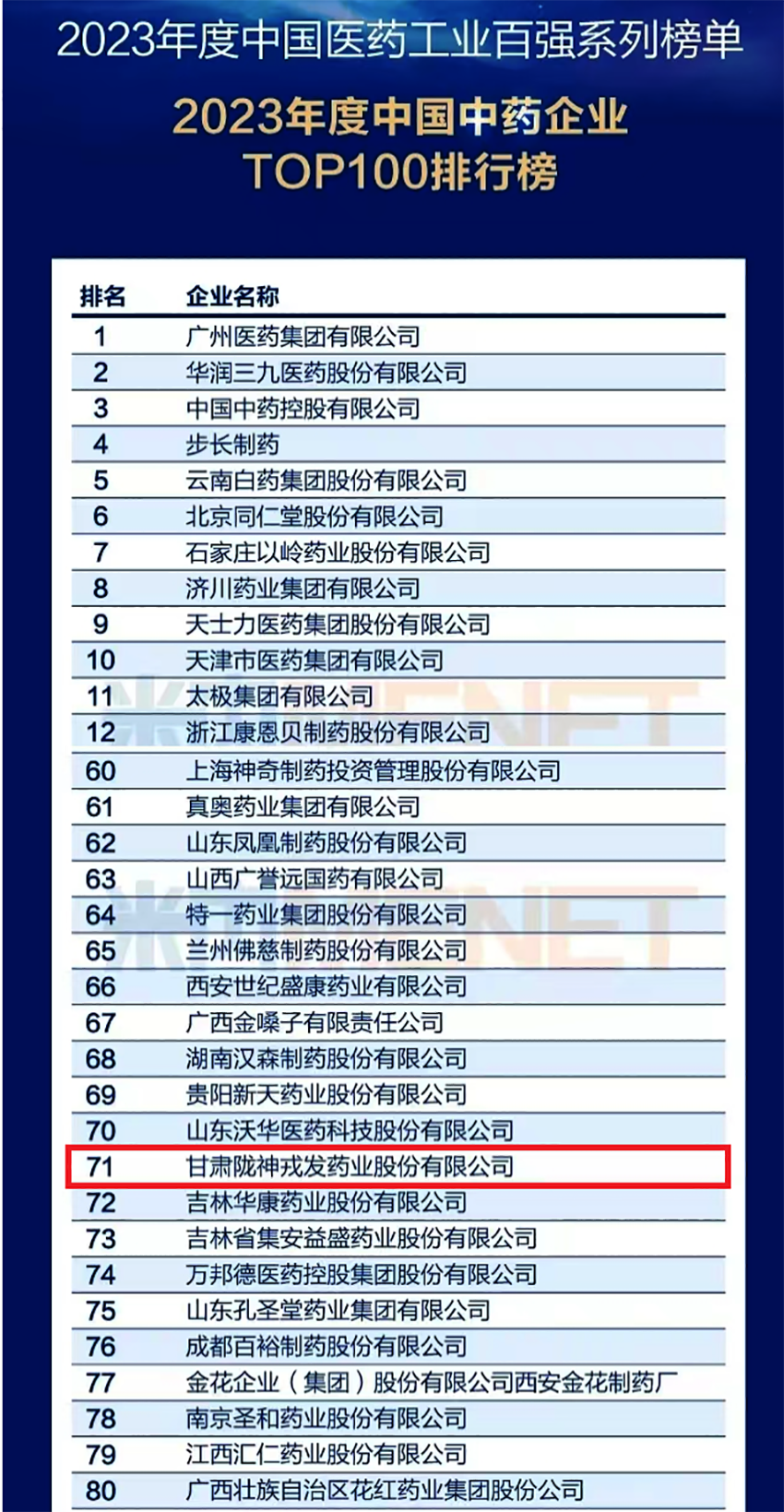 ããä¼ä¸ï¼â2023年度ä¸å½å»è¯å·¥ä¸ç¾å¼ºç³»åæ¦âéç£ åå¸ï¼å ±åå¸5å¤§ç³»åæ¦åå260家䏿¦ä¼ä¸ãä¸å½å»è¯å·¥ä¸ç¾å¼ºä¼ä¸æ¦æ¯å½å å ¬è®¤çå»è¯è¡ä¸æå¨æ¦åï¼ç»å为âä¸å½åè¯ä¼ä¸TOP100æè¡æ¦âãâä¸å½ä¸è¯ä¼ä¸TOP100æè¡æ¦âãâä¸å½CXOä¼ä¸TOP20æè¡æ¦âç5大忦åï¼ä¸æ¦ä¼ä¸æ¯ä¸å½æå ·å®åçå»è¯å·¥ä¸ä¼ä¸ï¼ä»£è¡¨å½å å»è¯å·¥ä¸çå屿°´å¹³ï¼å±ç¤ºäºä¸å½å»è¯å·¥ä¸ç¾å¼ºä¼ä¸çä¸ä¸ååå½±ååãçèéç¥æåè¯ä¸è¡ä»½æéå ¬å¸é¦æ¬¡æåå ¥éâ2023年度ä¸å½ä¸è¯ä¼ä¸ TOP100 æè¡æ¦âï¼ä½å第71ä½ãè·æ¤æ®è£çè¿æå为çè彿é墿§è¡çå °å·ä½æ å¶è¯è¡ä»½æéå ¬å¸ã
