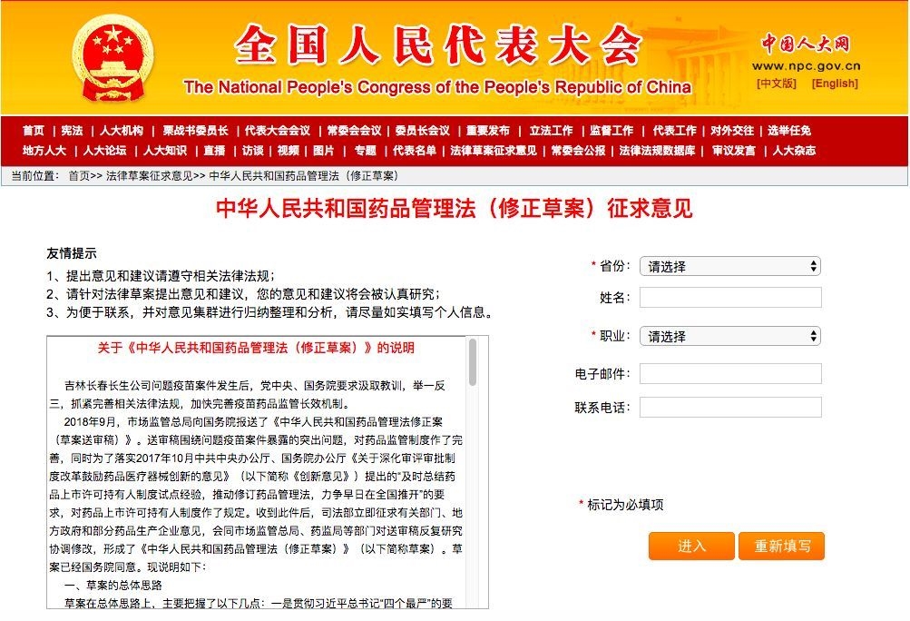 11月1日,《药品管理法》修正草案在中国人大网公布,开始公开征求社会各界意见,征求意见截至时间为2018年12月1日。
