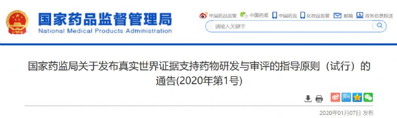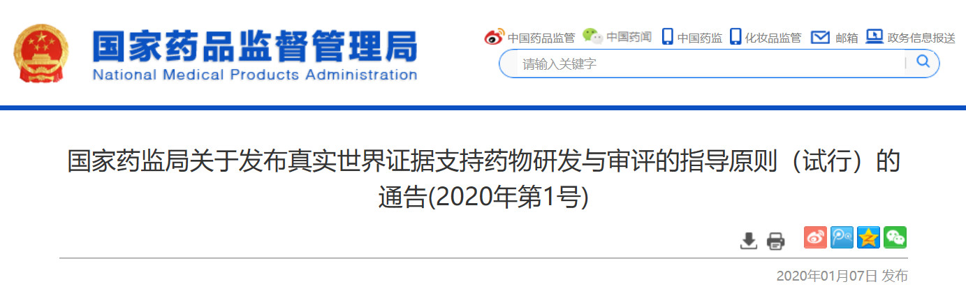 国家药监局发布真实世界证据支持药物研发与审评的指导原则(试行)的通告